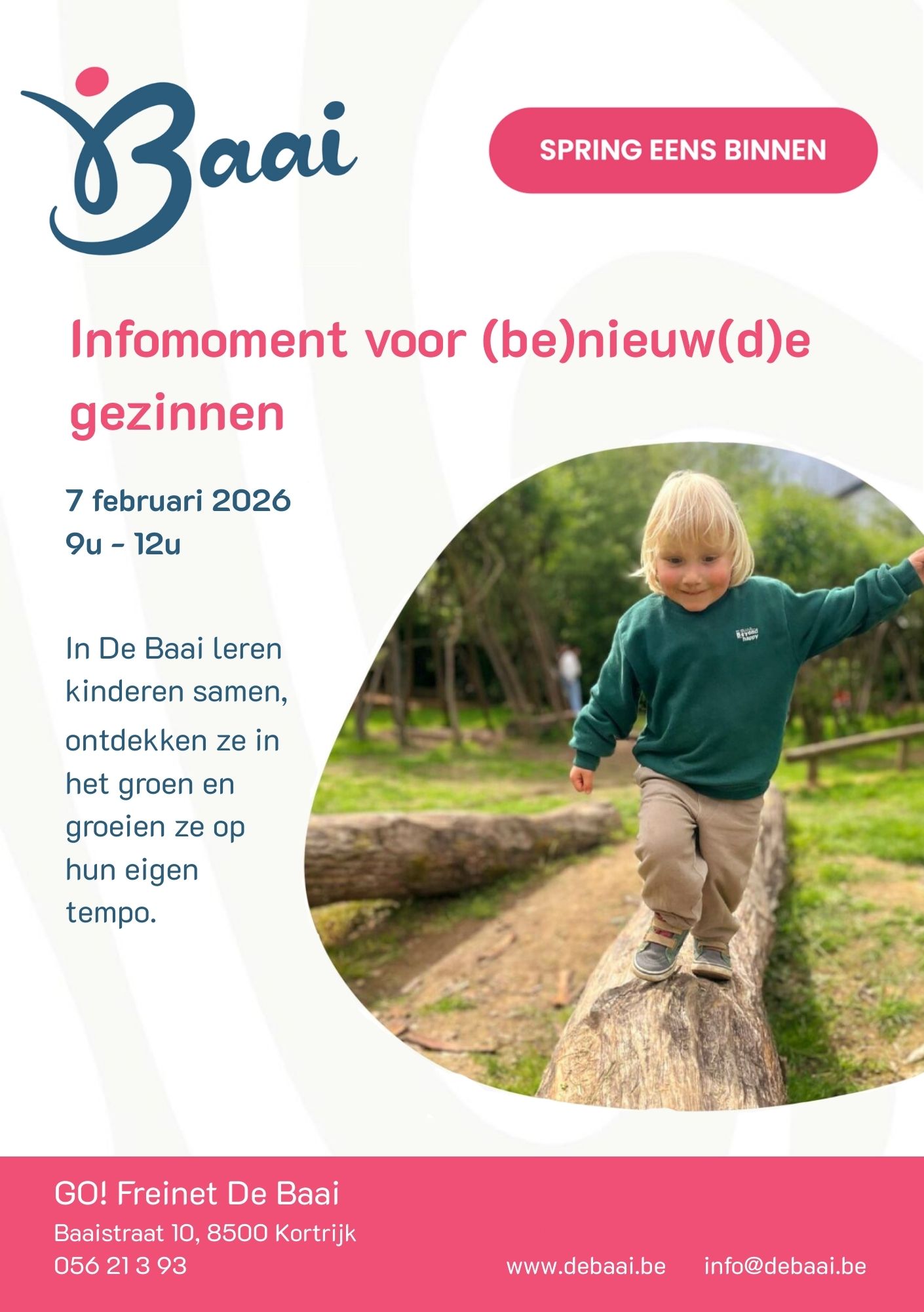Welkom in De Baai, een Freinetschool waar kinderen elke dag vol goesting op ontdekking gaan. Onder het motto “elke dag een avontuur” creëren we een warme, open leeromgeving waarin samenwerken en zelfstandigheid centraal staan.